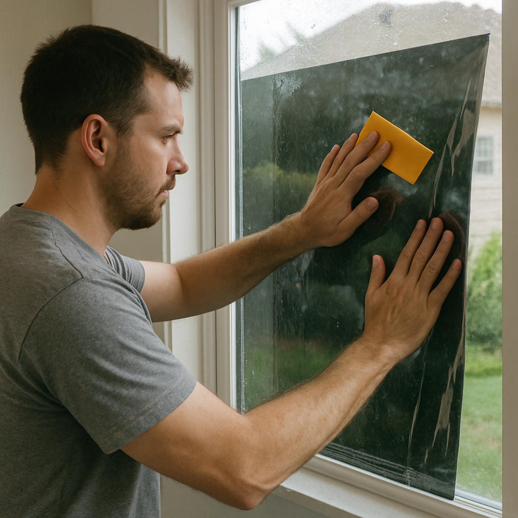 Spray the window with soapy water to allow for easy positioning of the film. Peel the backing off the film, place it on the window, and use the squeegee to smooth out any air bubbles. Trim the excess film with a utility knife and wipe the edges with a microfiber cloth.